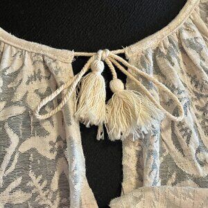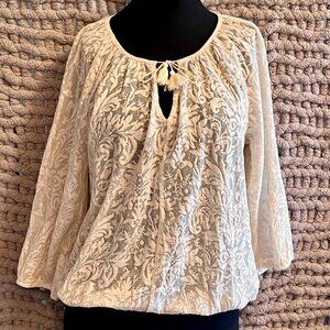 Chico's Elegant Ivory Burnout Peasant Blouse - 3/4 Sleeve & Tassel Detail Size M