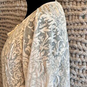 Chicos, Blouse, Top, Peasant, Tunic, Ivory, Cream, Off White, Burnout Velvet, Velvet, Damask, Floral, Patterned, Textured, 3/4 Sleeve, Three Quarter Sleeve, Tassel, Keyhole, Boho, Bohemian, Elegant, Sophisticated, Dressy Casual, Versatile, Flowy, Relaxed Fit, Pullover, Summer, Spring, Fall, Resort Wear, Date Night, Brunch, Workwear