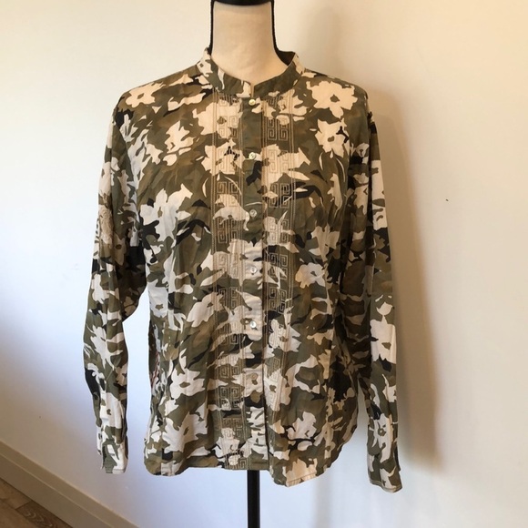 Chico’s camo floral button down shirt size 3 long sleeve with needlepoint design