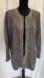 Black greyish colour tweed material with gold gem jewels lining the front up and around the collar.