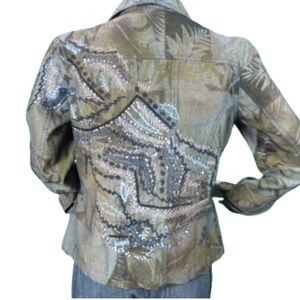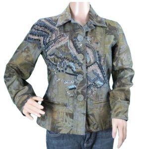 A jacket that is perfect for spring or fall! This jacket features a stunning leaf motif woven into its fabric, evoking the beauty of the forest in every stitch. Adding to its allure are the oversized buttons that adorn the front, making a bold statement and adding a touch of vintage charm to the jacket's design. These buttons not only serve as functional closures but also elevate the jacket's aesthetic appeal. But what truly sets this jacket apart are the large front pockets, perfect for keeping your hands warm on chilly days or for stashing essentials while on the go. These pockets add both practicality and style to the coat, enhancing its versatility and functionality. Whether layered over a cozy sweater for a stroll through the park or paired with a dress for a night out on the town. Embrace the beauty of nature and elevate your outerwear game with this enchanting piece.