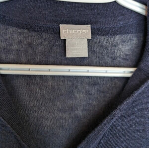 Chicos Navy Blue Linen Blend V Neck Collared Thin Knit Top Woman Size 1 Medium