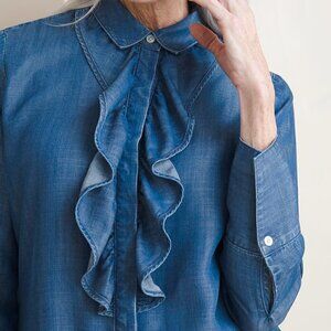 A lightweight, Tencel® fabric gives our ruffle denim tunic the look of denim with a more refined look and feel. It's beautifully crafted, featuring design details like a concealed-button placket, lavish, deep cuffs and an inverted pleat that adds shape to the back. We love it with jeans, pants and leggings for elevated casual style.