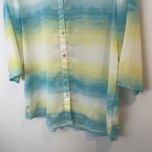 Chico's Sheer Colbie Button Up Top Sz 2 L Blue Yellow Ombre Sheer Tie Dye Blouse