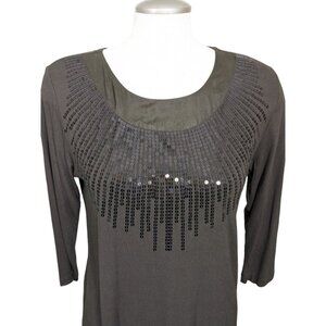 Chicos Size 1 US S 8 Womens Brown Sequin Front T Shirt Long Sleeve Stretch