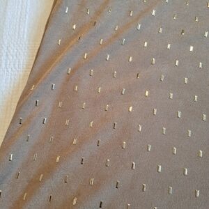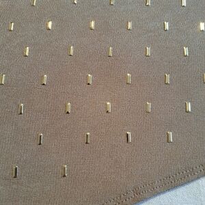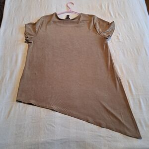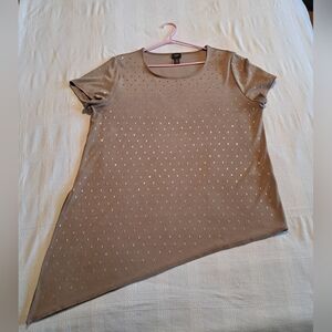 Chico's Travellers women's size 3 taupe colored asymmetric top, has little rectangles on the front, silky, flowy fabric. The longer side has an opened seam slit, perfect tunic length.