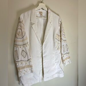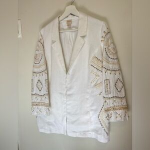 100% Linen outer and 100% cotton lining. In Size Chico’s size 1/Us size Medium.