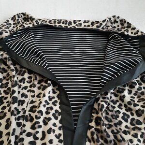 -Pattern: Classic all-over leopard/animal print in neutral tones (black, tan, cream). Inside lining is contrasting black and white stripes.