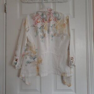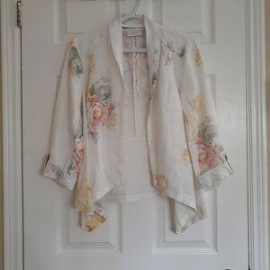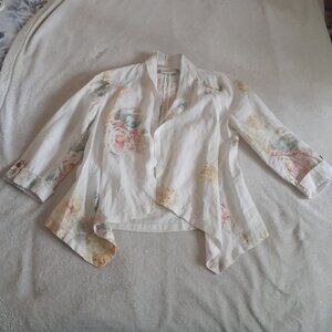 Chico's Women's Size Small (O) White Floral 100% Linen Open Draped Blazer