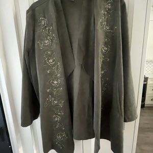 Features: open drape front, embroidery details, pockets, great faux suede feel,