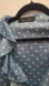Elegant blue dress with playful white polka dots. Features cascading ruffles for a stylish look. It is a wrap dress.