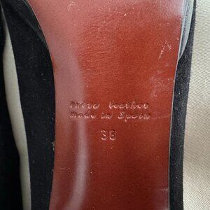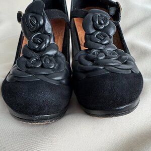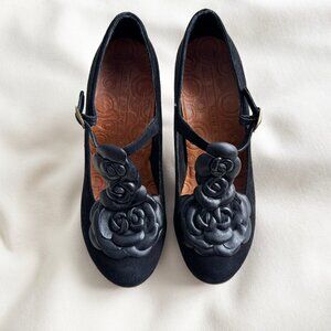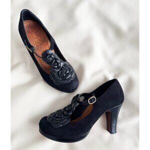 Chie Mahara Suede Pumps with Floral Leather T-Strap in Black, size 38. Fits true to size.
