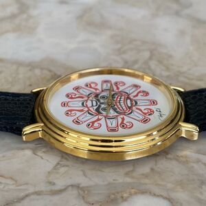 This watch wads received as a gift but never used. The main thing to note is the wonderful mask artwork by Chief Tony Hunt (1942-2017) on a clean white dial. The red and black artwork really stands out. Large 40mm case is gold tone, has black leather strap.