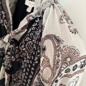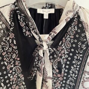A delicate chiffon blouse with a black and white expressive print and an elegant bow that can be tied in different ways. There is a soft black knitted lining on the back and front.