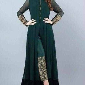 Chiffon maxi dress with a slit in the front showcasing beautiful embroidered silk straight pants.