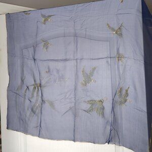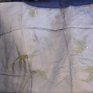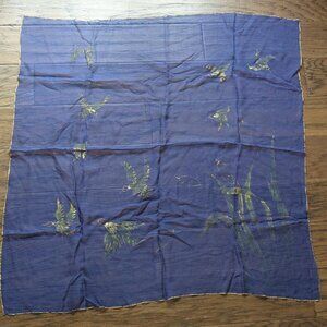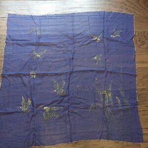 Vintage, probably 1960's scarf. Navy blue with gold hand painted ducks and bullrushes, gold painted trim in lieu of a hem. No tags at all. Very fine see-through fabric. This is from my Mother's and probably my Grandmother's closet before her. My Mother had a Mustang convertible in the early 60's and would have needed a head scarf to protect her fancy hairdo every time she drove in the warm weather with the top or windows down. That said, I don't think it has ever been worn, it is in excellent condition.
