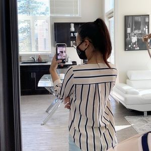 Flowy chiffon top with elbow button detailing - baby pink, with white and navy detailing