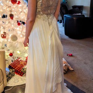 *It does really need cleaning* and it looks like someone pushed the bustle buttons through a layer of the bottom of the dress, so there are two small button sized holes at the base. Knowing that, I am open to offers. The dress just deserves a second life.