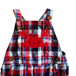 Adorable plaid shortalls by Child of Mine. Featuring a vibrant red, white, and blue checkered pattern and an eye-catching red crab appliqué on the chest.