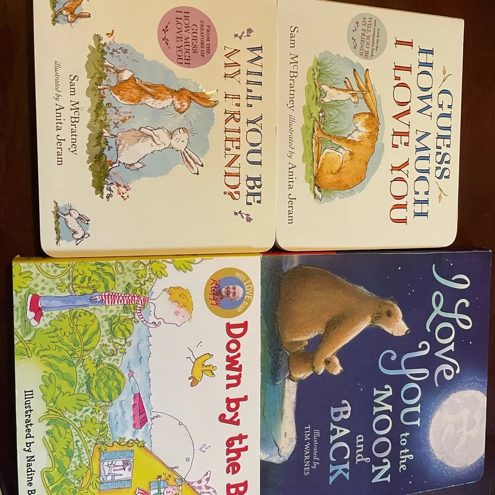 Set of four children's books with colourful illustrations. Includes titles ‘Guess How Much I Love You' and the sequel ‘Will You Be My Friend’. 'I Love You to the Moon and Back’ and ‘Down by the bay’ are also included.