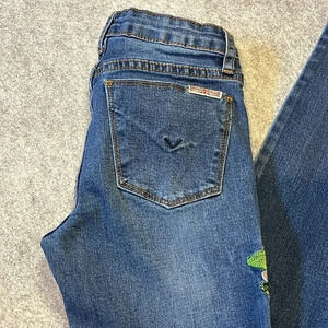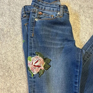 These are unique and super cute with the embroidery detail. They are a straight leg with a but of a skinny fit. The size tag has been removed so please refer to the pics for measurements.