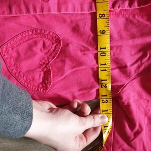 Adorable pink jacket with heart patterns. Features large buttons and a playful design.