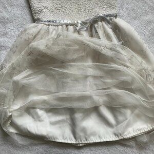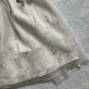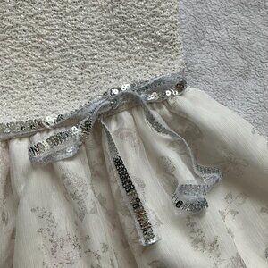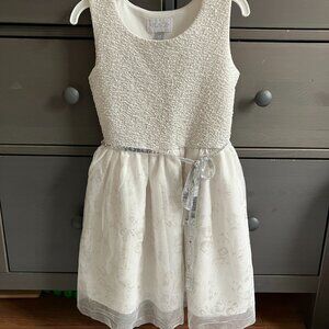 Children’s Place kids party dress, size 5/6. Tulle (3 layers) with glittery textured bodice, shimmery floral overlay, and silver sequin belt that ties into a bow at the waist. Pull-over style with lining for comfort.