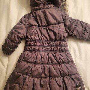 Classic children's dress or casual winter coat, full length. Hood with trim. Puffer style. Incredibly warm, versatile and so cute. Subtle metallic tone. Needlepoint detailing. A coat kids can grow into from age 4 and up. My daughter loved wearing this on those brisk nasty cold winter days, to school and speacial occasions. Designed in France. Vintage Catimini.