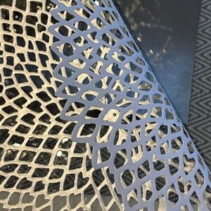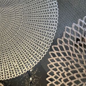 Chilewich place setting, laser-cut, perforated, organic shapes, in silver.