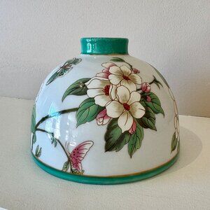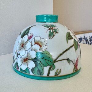Chinese blossom small ceramic vase, off white with turquoise trim, white flowers, and butterflies. Excellent used condition. Measures about 4.75 inches diameter, about 3.75 inches tall. Cat friendly, nonsmoking home.
