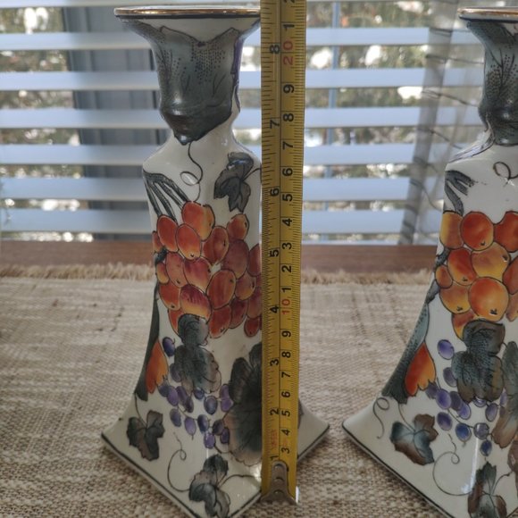 Set of 2 Porcelain Hand Painted Candleholders with Etched Outlined Design of Berries on Leafy Vine. Purple, Green and Orange Hues on White Background. Made in China, Square base, Round Gilded Rim Wax Pan Sconce, 8.5 inches in height and 3.75 inches in width and depth at its widest. Very Good Vintage condition, no chips, no cracks, and no visible wear marks. Please see pictures for further details