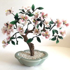 Chinese Jade Sweeping Sakura Blossoms Bonsai Pink Glass Tree in Celadon Pot