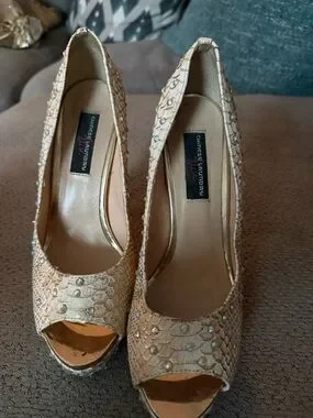 Elegant champagne peep-toe heels with textured upper. Sparkling rhinestone accents across the shoe. Slight platform and classic heel silhouette. Dressy choice for special occasions.