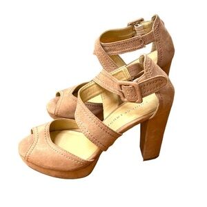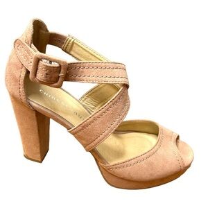 This shoe features an open toe, buckle strap across the vamp, Platform finished with a chunky heel.
