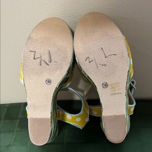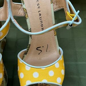 Bright yellow wedges with playful polka dots and pineapple print. Stylish and fun design by Chinese Laundry. Someone has written 7.5 in black marker on each shoe. See photos. Otherwise really good condition