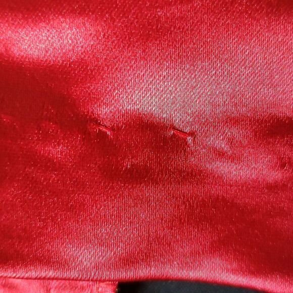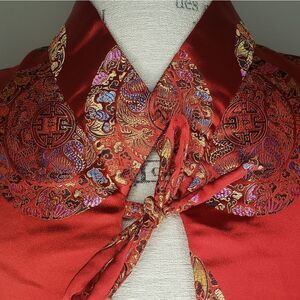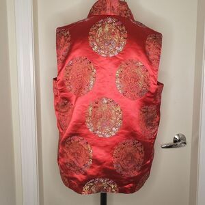 Red Chinese 'Tang Suit' style shirt vest with circular Shu brocade 'Ba Duan Jin' pattern interwoven with gold blue purple & black thread the centre symbol representing long life.