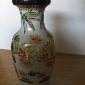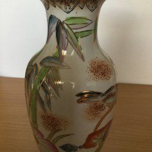 Chinese porcelain vase hand painted w flowers, bamboo, birds, gold 8.25"