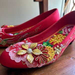Step out in style with these elegant red floral embroidered women's shoes. Perfect for adding a touch of sophistication to any outfit. Red Bridal Shoes, Chinese Wedding, Bridal Shoes, Wedding Gift, Traditional Handmade Red Floral Wedding Shoes. Size 39. Insole measures 9.5". Missing gold petal, see pics for condition.
