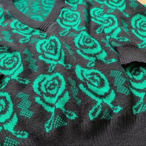 This retro sweater was all the hype in the 80’s. Bright Green roses all around with tapered bottom it would make a perfect sweater dress too if you can pull it off !!! Size medium , no known flaws !