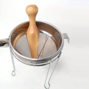 -Place strainer in handy chrome stand while using pestle to press food through mesh.