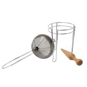 -3-piece set includes an 18/8 stainless-steel 7" fine mesh chinois, a wooden pestle, and a chrome stand.