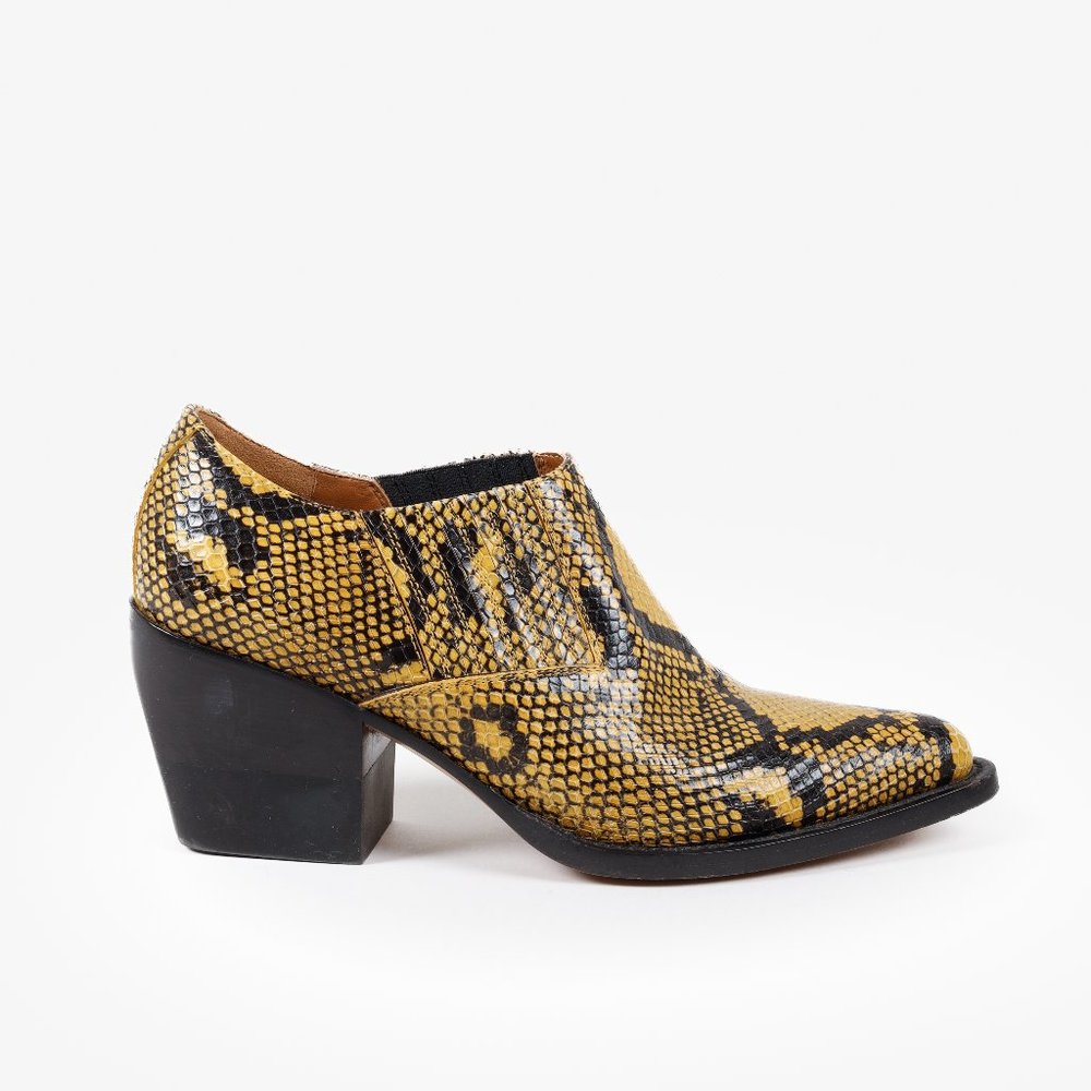 Crafted from python printed calfskin leather in yellow, the famous Rylee boots from Chloé come in a short slip-on western silhouette with a pointed toe, elasticated tonal sides, and a wide block heel. These boots feature soft leather lining, matching insole embossed with the brand name, and a leather outsole.