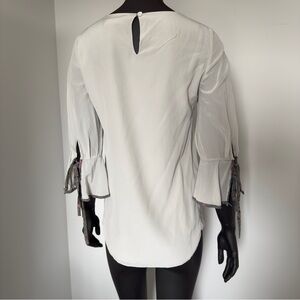 • Sleeve detail: Sheer bell sleeves with floral lining and side-tie