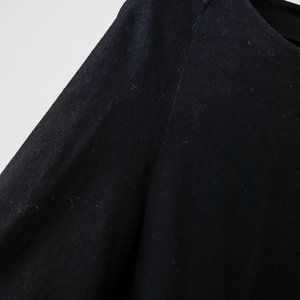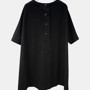 A short sleeve trapeze dress in midnight blue wool, featuring raglan sleeves, a wide neckline, a button closure down the back, and two large welted front pockets.