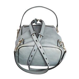This stylish backpack is crafted of washed blue calfskin and suede leather. The bag features adjustable leather shoulder straps, a suede flap, an additional single shoulder strap, and has a decorative draping gold-tone chain that clips to gold ring closure. The flap opens to a beige fabric interior with zipper and patch pockets. This compact bag is ideal for everyday necessities, from Chloe!