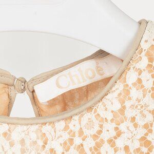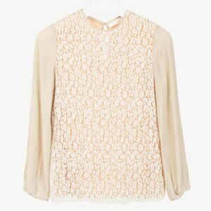 Made in France, this blouse from Chloe's 2012 Autumn and Winter runway collection is crafted with silk crepe on the sleeves; and Chalk cream lace on the body. It features long sleeves, buttoned cuffs, a round neck, a back buttoned keyhole, and nude silk crepe lining on the body.
