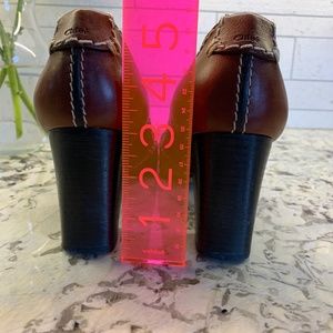 Stylish - beautiful hardware. Cognac/chestnut with cream contrast stitching. Rarely worn - heel measures 3 inches and insole measures 10.5 inches.