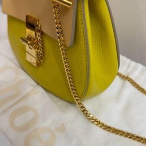 This authentic designer Chloe bag in a stunning yellow/green hue is the perfect accessory to elevate any outfit. Get ready for summer! This Chloe 'Drew' Bag is two-tone with gold hardware and beautiful gold metal strap with lock and accents.