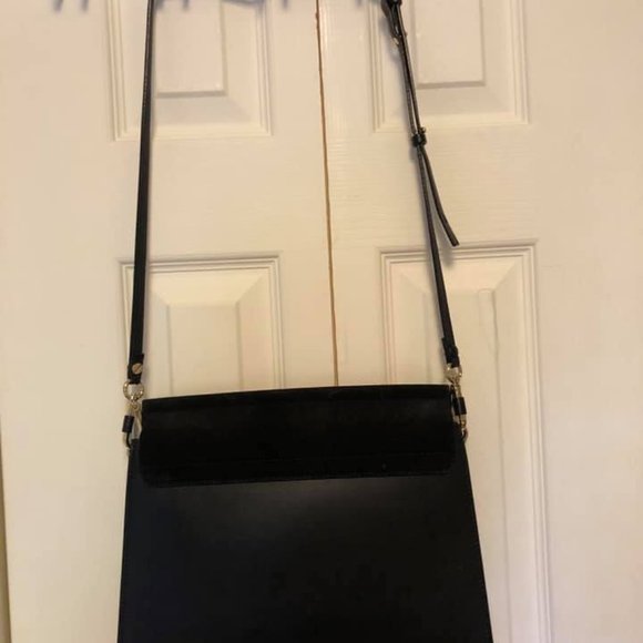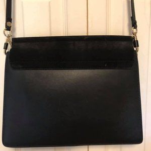 Black leather and suede Chloé Medium Faye bag with multi-tonal hardware, single adjustable flat shoulder strap, debossed logo at front, beige suede lining, dual compartments, single zip pocket at interior wall and magnetic snap closure at front flap featuring O-ring and chain-link accent.