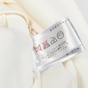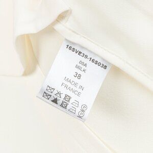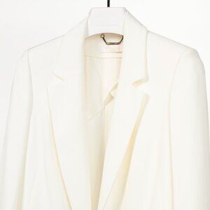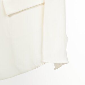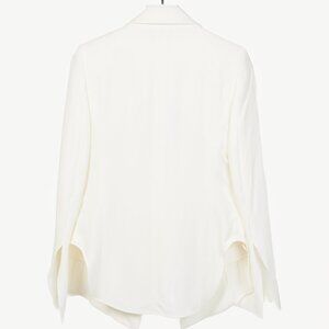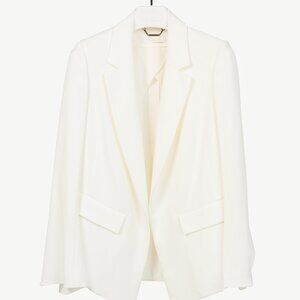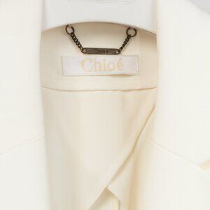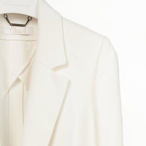 Made in France, this blazer from Chloe circa 2016 is crafted in a Milk ivory crepe, and features long bell sleeves, vented cuffs, padded shoulders, a notched lapel collar, an open front, front flap pockets, open sides, and is partially lined in a tonal crepe.